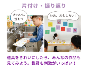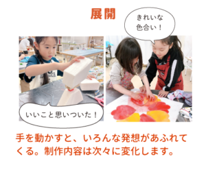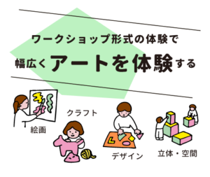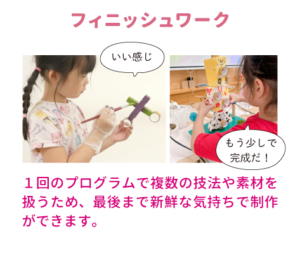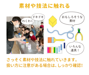 体験時の制作に必要な用具は教室でお貸ししますので、手ぶらでいらしてください。教室には画材等で汚れても良い服装でお越しください。小さなお子さんはスモック・エプロンもおすすめです。
