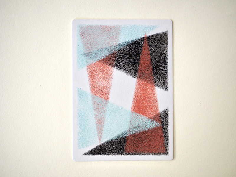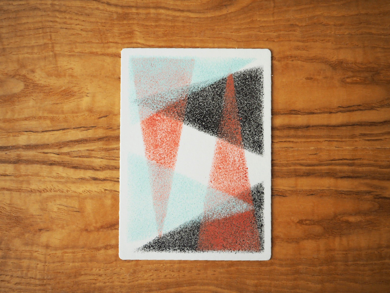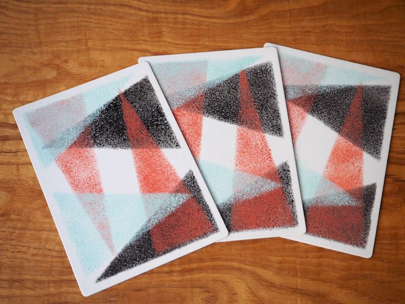 使いたい絵具を買うところからスタートしました…。ちなみに、ジャパネスクカラーというバージョンです。これも黒ではなく、消炭色、真朱、淡水色という3色で、通常カラーのような光沢がなく、ステンシルに使うと砂みたいでした。