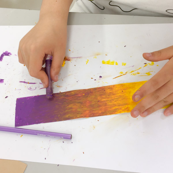 そのクレヨン・クレパスを使って、紙の上で2色をじわじわ混ぜ、2色以上の色を増やしていく実験をしました。重ね方、力加減などの工夫でなめらかな色の階調ができると「グラデーション」が生まれます。「すごい!」それぞれの塗り方を参考にしながらみんなヒートアップ。コツがつかめたかな?