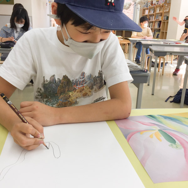 オキーフの絵はこどもたちに「すごくきれい」と大人気。その色を丁寧に再現したいという意欲を感じる制作でした。描く部分に合うよう画材を選んで使い分けたり、それぞれの工夫がありました。