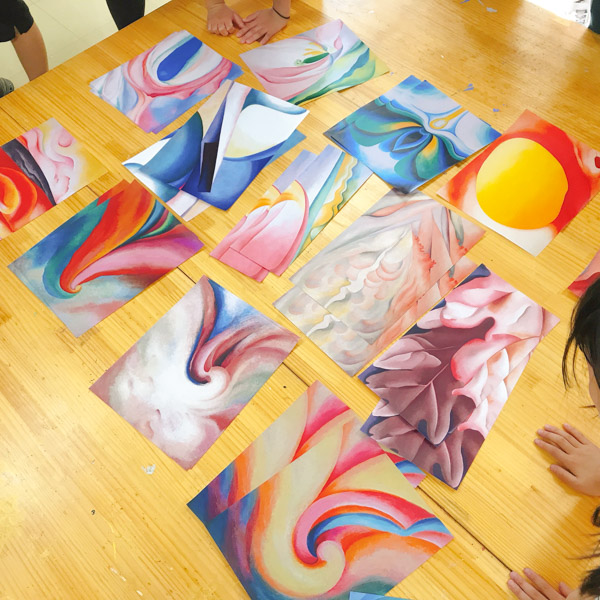色使いのバリエーションが豊かなオキーフの抽象作品。1点ずつまったくちがう雰囲気があるので、こどもたちは「あれもいい、これも……」とお気に入りの1枚を選ぶのが楽しそうでした。