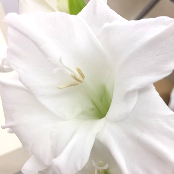 パステルの扱いに慣れてきたところで、絵画制作のモチーフ、グラジオラスが登場しました。白くて小さめのお花がたくさん並んだ姿が特徴的です。近くに置いて、お花をさらにじっくりと覗き込んでみましょう。