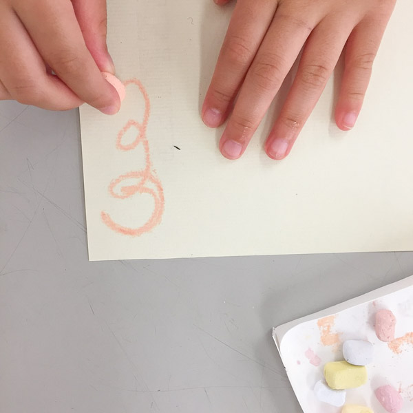 前回手作りしたパステル。しっかり乾燥していました。授業のスタートで描きごこちをさっそくお試し。材料を測り間違えると硬くなり描けなくなると聞いていたこどもたちはちょっと緊張でしたが…「描けた!」見事に全員、きちんと描けるパステルを作っていました。