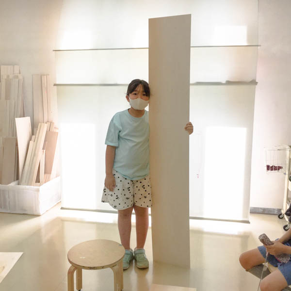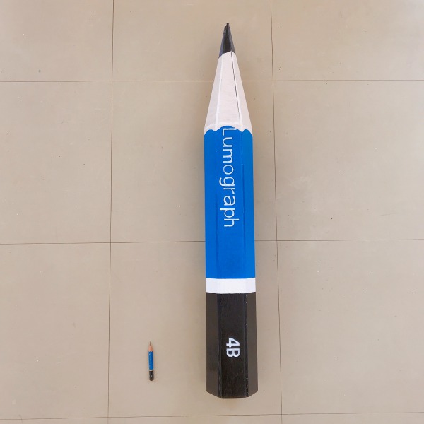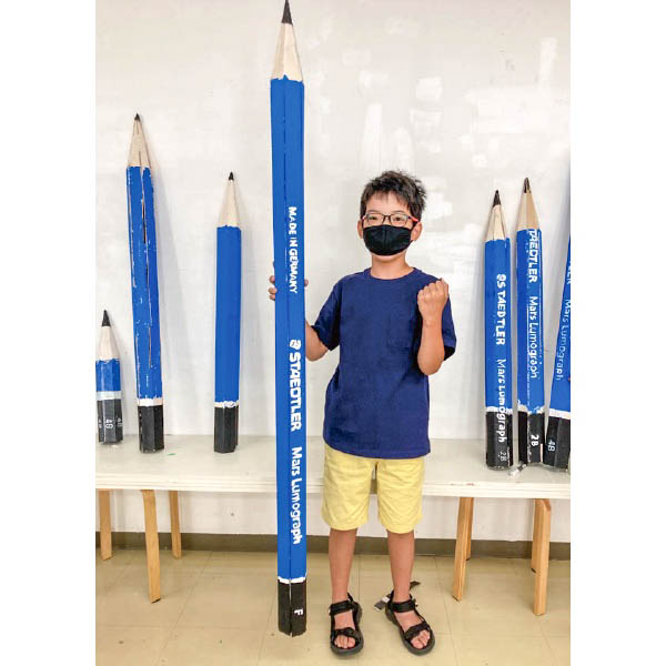 先生が作った大きなえんぴつが教室に登場すると「なんだこれ!」どっと盛り上がったジュニアコース。 もっている子が小人になったようにも見えますね。トルネードのこどもたちも持っている、ステッドラーのえんぴつがモチーフ。ジャイアントなアート制作のはじまりです。