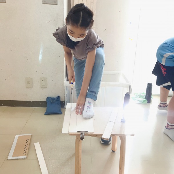3年生も、4月に一度のこぎり制作を体験しているので、のこぎりの扱いはみんなしっかり覚えていました。今回はとても薄い板なので、切る力よりも特に押さえる力が大事。切っている時のギコギコ音や感触がちょうどいいかを自分たちでチェック。「あ、ちょっと曲がってきたかも」「いいかんじ!」まっすぐを目指して切り続けるこどもたち。