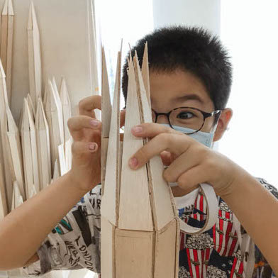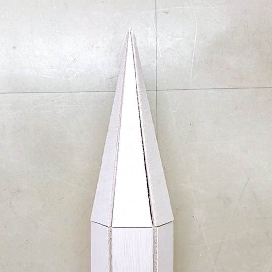 一気にえんぴつらしい形になりました。見本を見たこどもたちも「おお!」と盛り上がり、早く組み立てたくてたまらない様子でした。えんぴつの長さによっては、ひとりだと大変なところもあるので、こどもたち同士で「ここを押さえて!」「一緒につくろう」という協力体制が良かったですね。