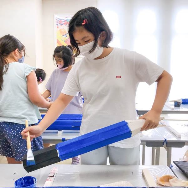 すきま埋めが完了した子から、ステッドラーえんぴつのシンボルカラーである青・黒を塗る制作へ。幅の広い筆が大活躍!塗っている間にすぐ乾くくらい、絵の具の量を最低限で仕上げるのがコツです。みんな手際がいい!教室はさながらえんぴつ工場のよう!?