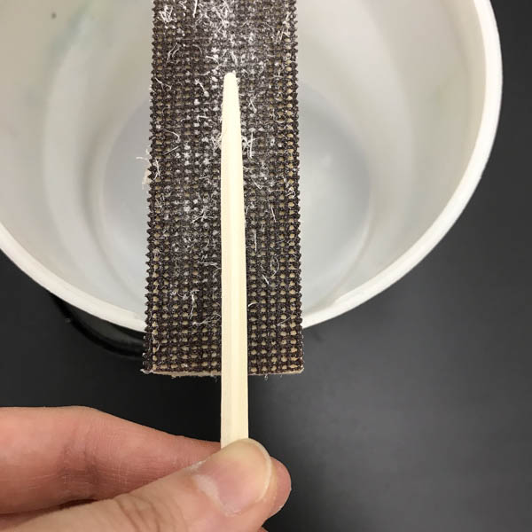 わりばしの先を、それぞれ削り出して全体の形を作っていきました。包丁とぎのように、やすりは土台に固定してわりばしを滑らせるように削るととてもスムーズ!どこが削られているのか、手を動かしながら目でしっかり確認できていましたね。それぞれねらう形に近づけていきました。