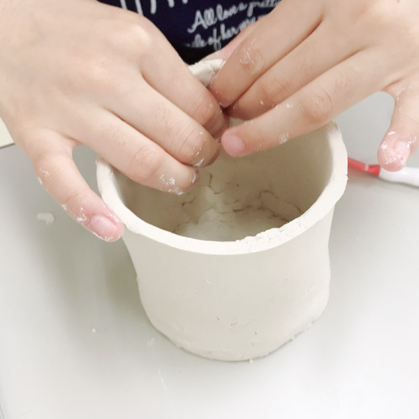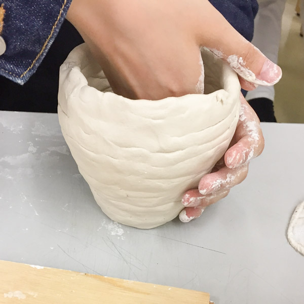 粘土をひもにして積んでいく「ひもづくり」は、ボウルのような膨らみのあるデザインの器にぴったりの造形方法。器用に粘土製のひもをくるくる巻いてあっという間に壺ができた子も。