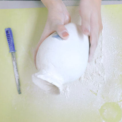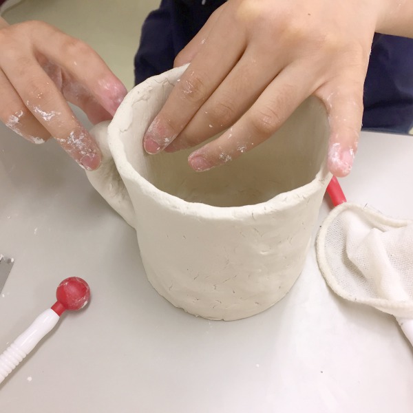 粘土を平らな板状にして作る「たたら成型」。円筒状のコップなど、均一な厚みで、まっすぐとした壁をもつ形作りに便利な造形方法です。