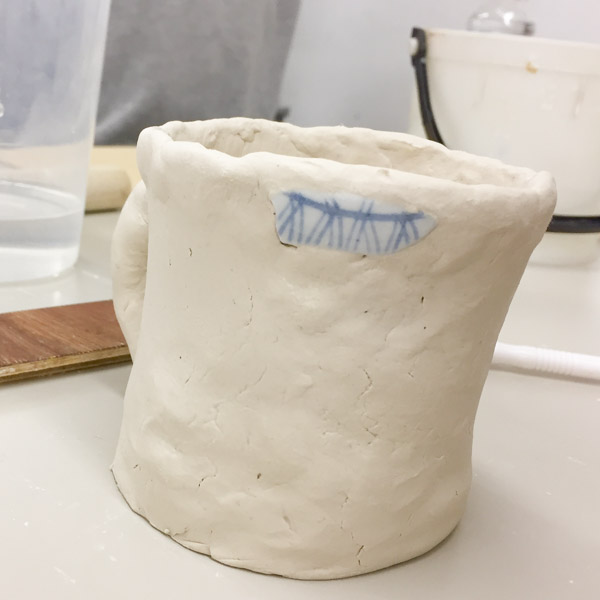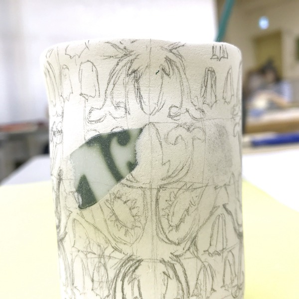 焼き物の絵柄はガラス質でできており、陶芸窯で高温で焼いた際にまわりの色と少し溶け合うために独特のじんわり感があります。その質感まで表現することを目指しました。どこにかけらがあるかわかりますか?うーん、さすがラボ!