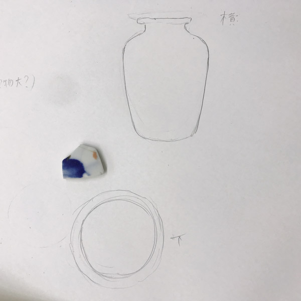 選んだかけらを触ってみると、完全に平らではなく少しカーブになっていたり、厚みの差があったり。かけらになる前の元の形の手がかりが。思い浮かぶイメージをスケッチしておきましょう。