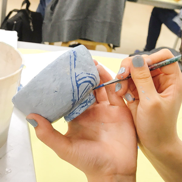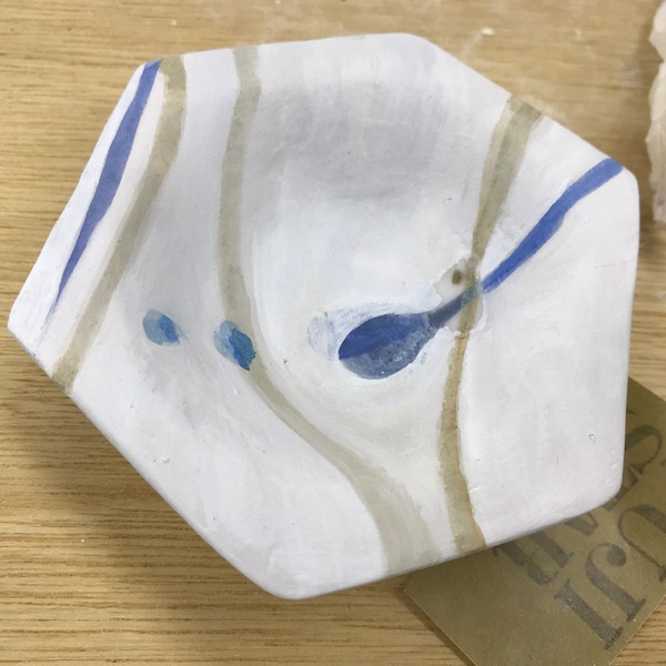 かたち全体が整ってから、かけらの色・絵柄の続きを描きました。ヨーロピアン風、和食器風、割とカジュアルな近代風など、こどもたちそれぞれのイメージがすでにあったようで、それぞれスムーズに描き始めました。