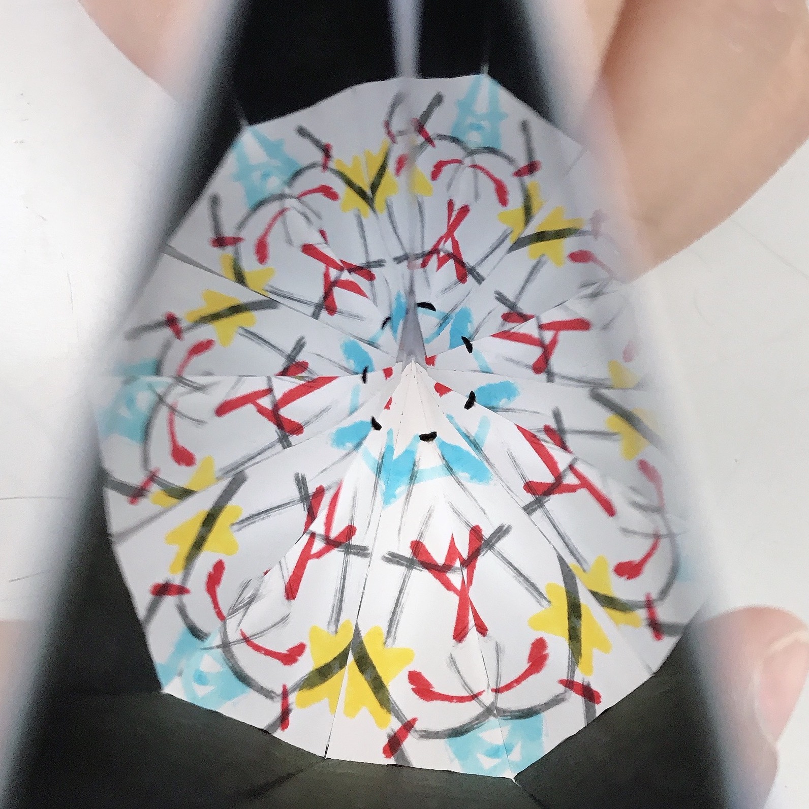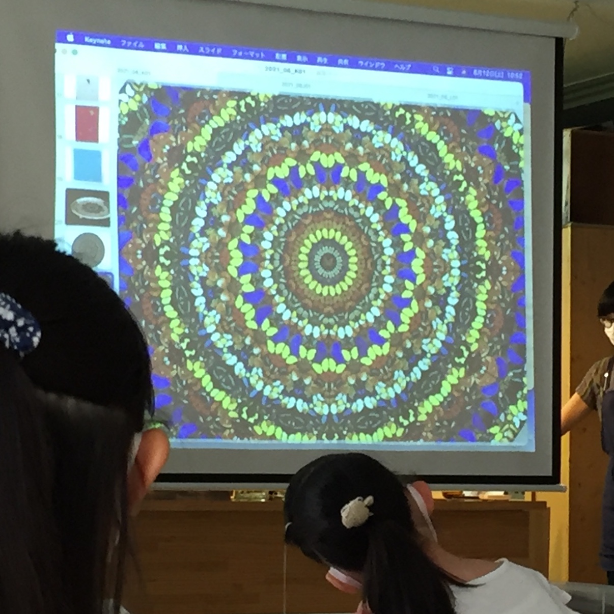 前回つくった万華鏡、おうちでもいろんなものを見てきたこどもたちがたくさんいました。今回と次回のプログラムでは、この万華鏡とおなじ仕組みの「回転対称」の絵画づくりにチャレンジします。