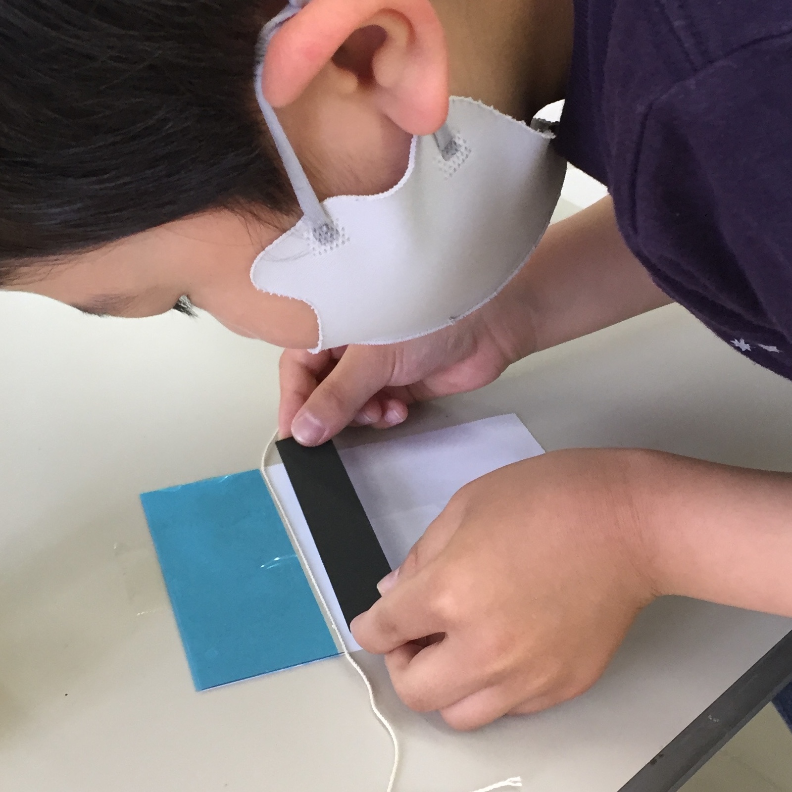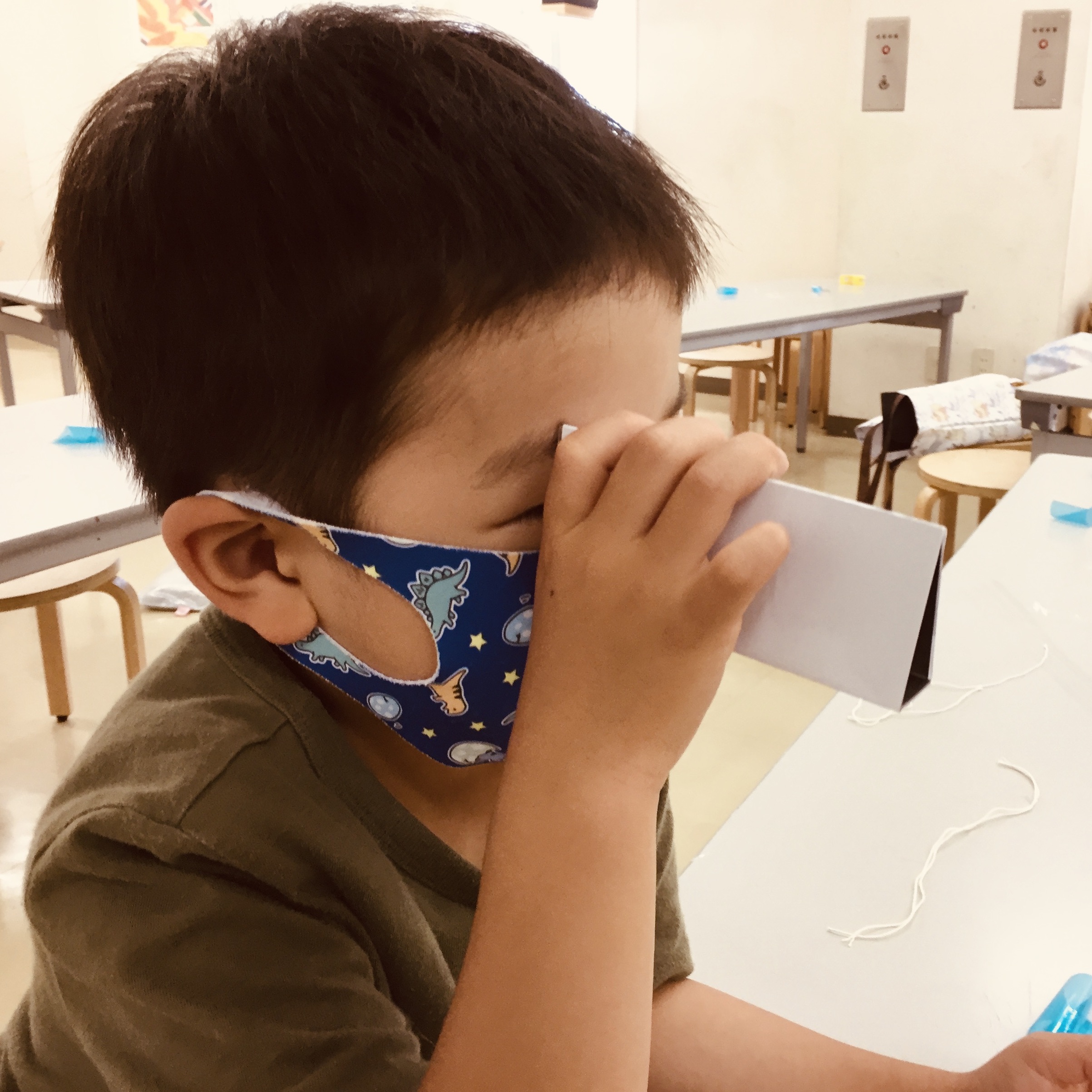 もようの秘密を探るため、自分たちで万華鏡を手作りしました。ミラーに指紋をつけないように、糸1本分の隙間をあけて紙を貼って…など細やかな工程を、ひとつずつ進めてみんなでクリア!