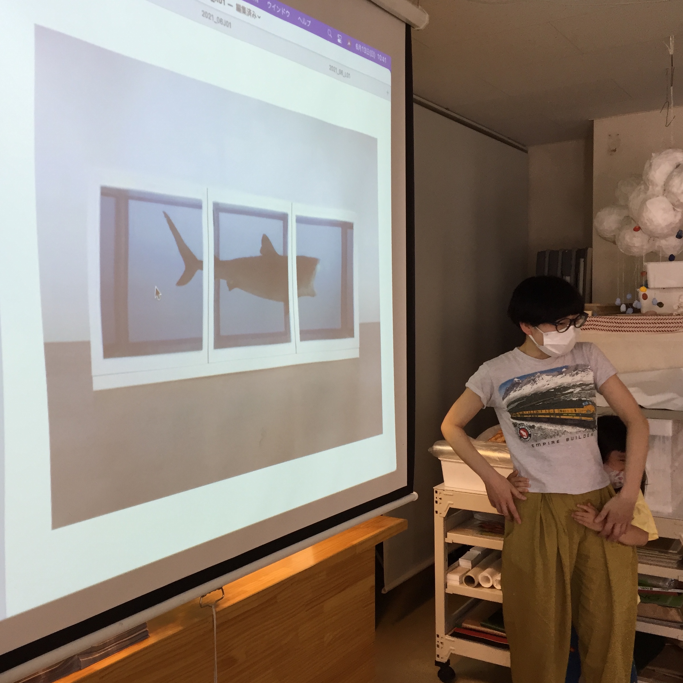 6月のキッズコースは、こどもたちがはじめて知るであろう、現代アーティストのダミアン・ハーストのアートを参考にした制作を実施します。まずは作品を見てみることに。