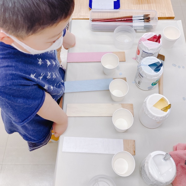 ひとしきり万華鏡の制作を楽しんだ後は、来週以降の絵画制作のために大きな板をペイントする工程がありました。それぞれ使いたい色の絵の具をひとつ選びます。