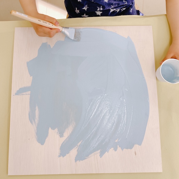 大きな平筆で板を塗りました。なるべく平坦になるよう、筆で何度か表面を撫でて絵の具だまりをなくしました。板の厚みの部分までしっかり塗り広げて、今週の制作は完了!