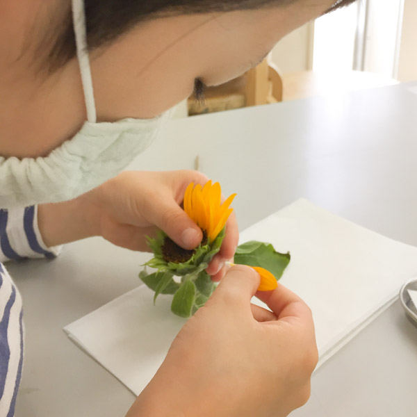 今回作る絵には、同じ色・同じ形の素材が複数必要です。今回は「8個ずつ」をルールにして、素材づくりを進めました。香りに惹かれた子はいいにおいの葉っぱをチョイスししたり、爪より小さいお花まで上手にカットして素材を集めている子も!