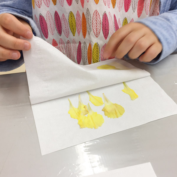 前回に押し花の素材をたくさん作ったこどもたち。約1週間、本にはさんでいた素材を取り出すと「ぺらぺらになってる!」「おもしろい」とても小さな花びら、大きめの葉っぱ、サイズ、色、形もさまざまな素材が揃いました。