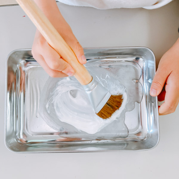 押し花を自分の板に接着するために、ボンドと水を混ぜたのりをたっぷり用意しました。乾くと透明になるボンド。素材の上に塗ると、絵画のトップコート剤にもなって便利!フランス語で「デコパージュ」というコラージュ技法の方法で、たくさんの素材を貼りましょう!