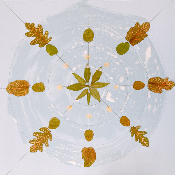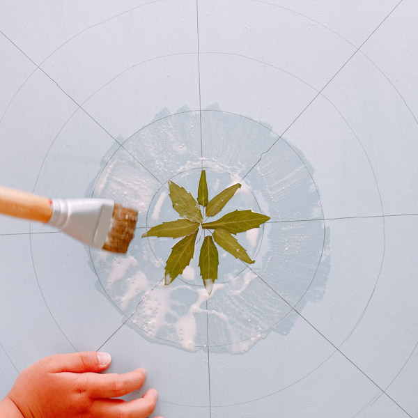 板の真ん中から押し花を貼りはじめました。今回は「8個ずつ」が基本のルール。前回自分たちで引いた8本のガイドラインを手がかりに、どこから見てもぐるりと同じ方向になるよう規則ただしく。いきなりすごい集中力で、細やかな調整をしながら貼り始めたこどもたち。教室がしーん……張り詰めたような静けさになったクラスも。