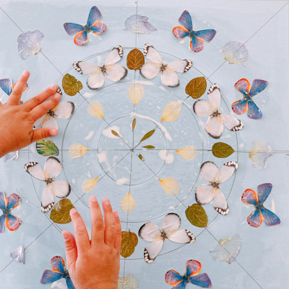 押し花素材を使った後に「まだまだ貼りたい」「素材がもっとほしい」というこどもたちのために、追加の素材として蝶々の紙素材も用意しました。「わあ!きれい」「ほんものみたい!」ここでさらに制作への意欲がアップ!