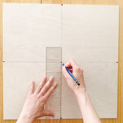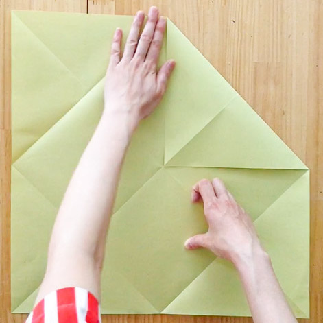 次は絵の下地づくり。絵のガイドを書くための型を作りました。必要な長さを数値で出すのはキッズたちには少しむずかしいですね。でも折り紙ならできる!角に合わせて折ると「等分」、2回折り畳むと「中心」が出ます。作る絵と同じくジャンボサイズの紙でチャレンジ!