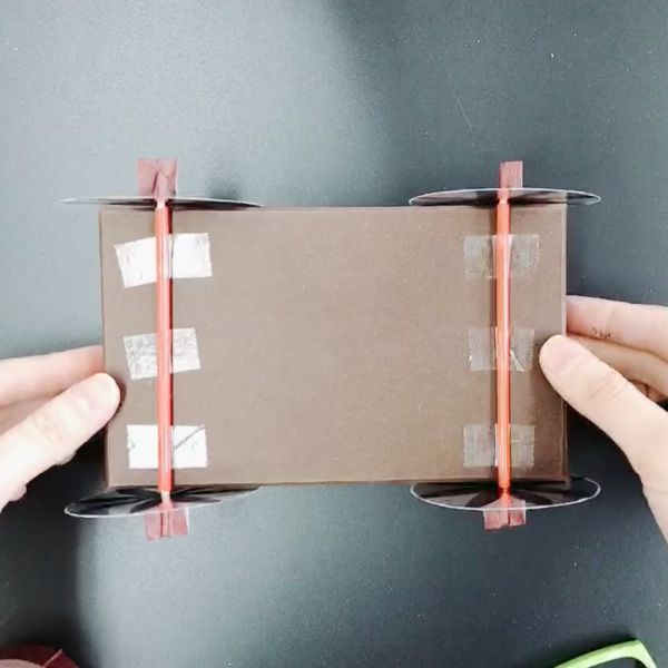 こだわりの車輪パーツを箱部分と接合しました。セロテープは手軽な道具ですが扱いひとつで剥がれやすくなることも。グラグラ取れやすい車輪にならないよう、貼ったあとはしっかり指でこすったり撫でたり…テープののりを素材にしっかり食いつかせて。