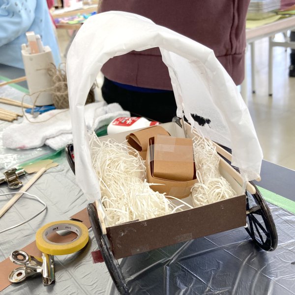 次回は馬車の外側・内側を仕上げます。「もっと人をのせたい」「中をごうかにしたい!」「のるためのステップがないと…」「2階も作れるかな?」こどもたちからいろんな方向性の「作ってみたい」がどんどん生まれていました。みんなのアイデアがそれぞれどう形になるのか楽しみです。