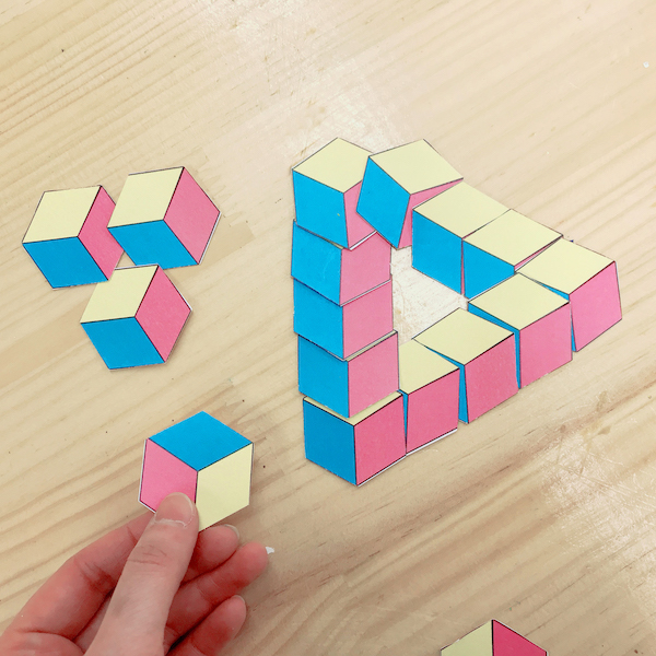 紙製の立方体風ブロックを並べて、不可能図形を作ってみることに。初めはみんな同じ構成を試してみましたが、コツが分かるとだんだんオリジナルの形の実験がしたくなる。