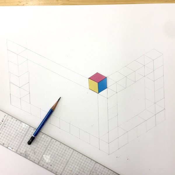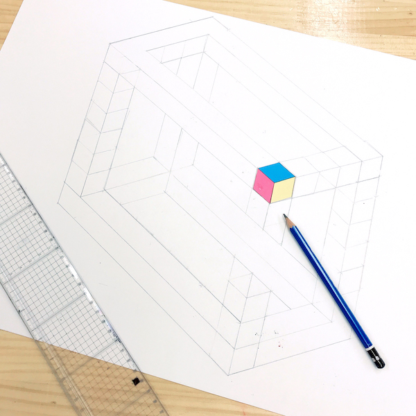 「えいえんの絵」の制作へ。図形が正確なほど、現実にはない見え方が強まって面白くなる制作のため、みんな少しずつ丁寧に進めていました。