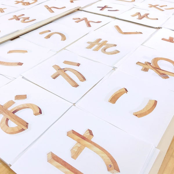 木製文字を印刷した紙の裏を鉛筆でゴシゴシ塗り込み、カーボンのように別の画用紙に形を描き写しました。初めて体験する技法だったようで「おお!」「これは便利」
