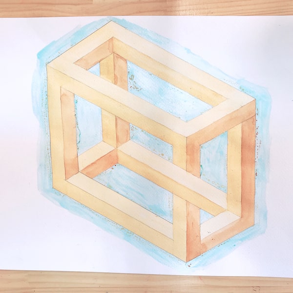 不可能図形を描いたら、具体的なイメージが見えてきた子も。はしごをかけたり、窓やドアがあったら建物にもなる。車や、ブランコなども置いたら道路みたいになりそう…ミニチュアの世界観ができてきた!