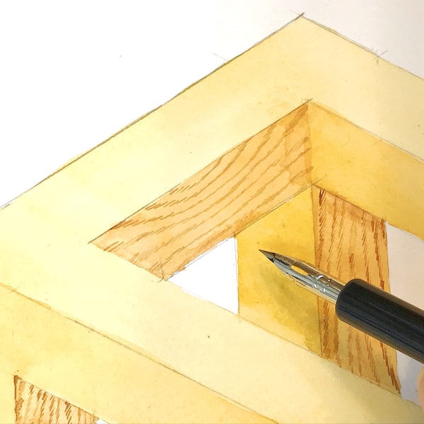 つけペンと茶色インクを使って、木目の細密な描き込みに挑戦。細かい作業が得意な子は「楽しい!」苦手な子は「つ、つらい…」それぞれの進めやすい方法を探り木製文字を仕上げました。