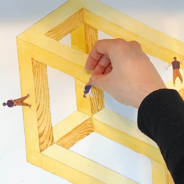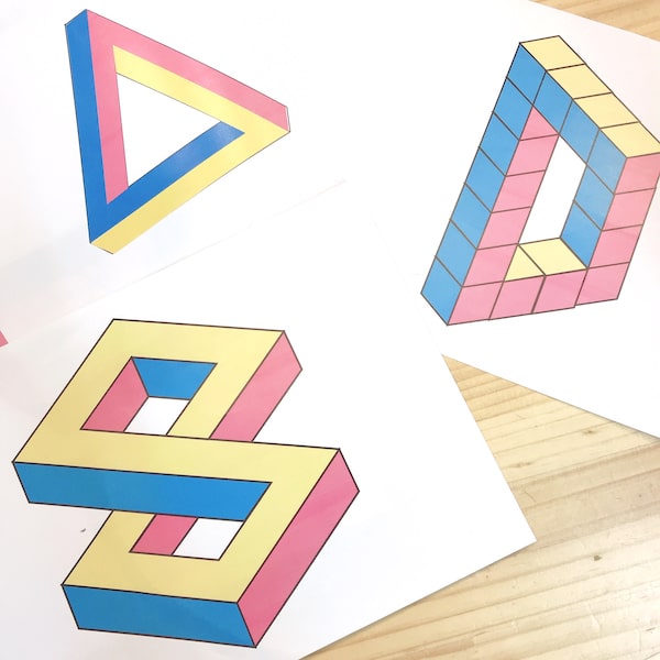 ペンローズの三角形をはじめとした「不可能図形」をこどもたちに紹介。安野さんの『ふしぎなえ』やエッシャーの作品のおかしなところに注目!