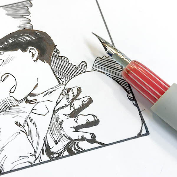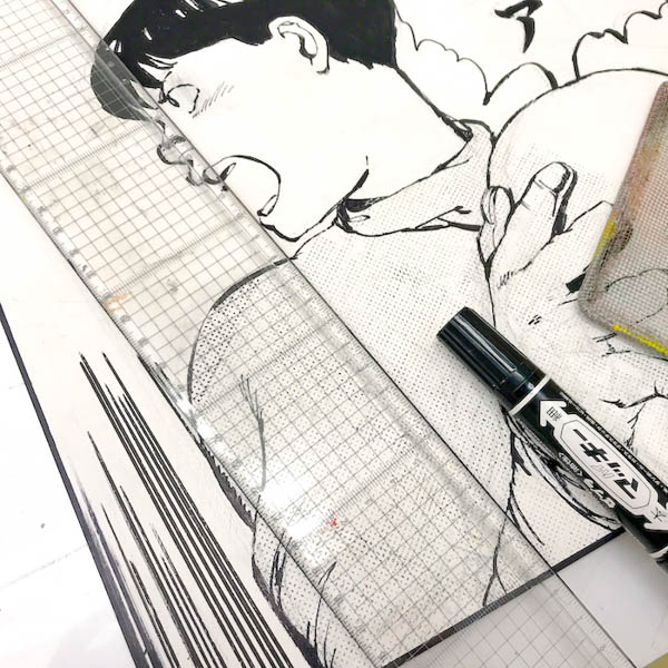 最後に、コマの外枠の線にペンを入れたら完成!もとはたくさんのページの中にあったたったひとつのコマですが、このように大きく引き伸ばしてみると別の存在感が感じられます。1コマ1コマがずっしりとした重みのあるアート作品に変身していきました。