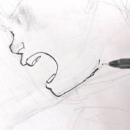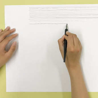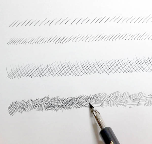 インク壺にペン先をちょんとつけて試し描きをすると...「描けない!」普通の鉛筆やペンのような持ち方では1本の線すら描けないのです。慣れないうちは筆圧加減がわからず、線が太くなったり、細くなったりして、つけペンは習熟に時間のかかる画材です。しかし描きにくいけどおもしろいらしく「いつまでもできる」「家でもしたい」という声多数。