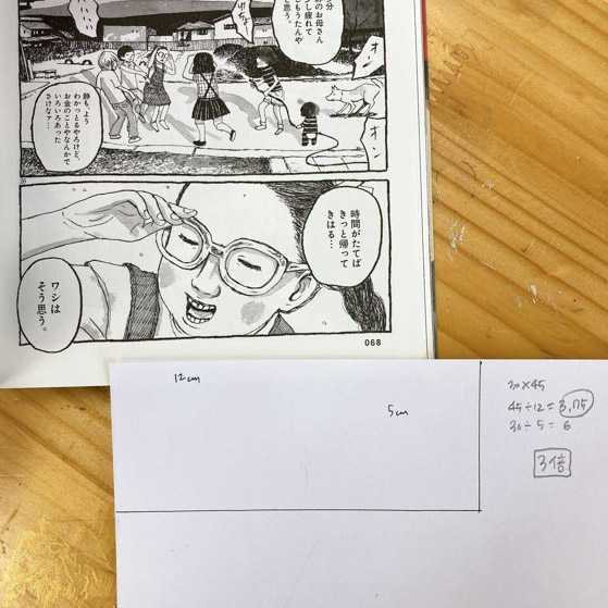 描くコマが決まったら、小さなコマを大きな作品にしていくためにそれぞれ拡大の計算をしていきます。定規でコマのサイズを測ったり、縦横の長さを掛け算して出していくのですが...これが低学年にはとても難しい!教室内が大混乱になりそうなところ、算数が得意な子たちも手を貸してくれ、どうにか計算を終えることができました。