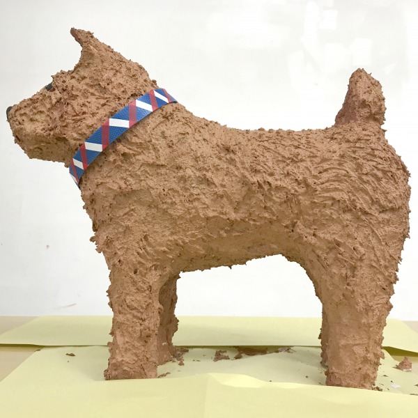 骨組みの形が決まったら、アルミホイルを丸めてつけて頭部や太ももなどの肉付けをしていきました。頭が出てくると急に犬っぽくなった?!でもメタリック素材のせいか「ロボット犬みたい」次週に続きます。