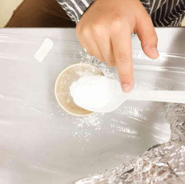 カップにお水を入れたら、スプーンで石膏の粉をどんどん入れていきます。その際、混ぜたり無理に沈めようとしないこと!石膏がカップの底にたまって積み上がっていき、水面まで出てきたら定量の合図です。