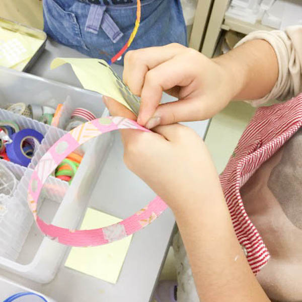 犬の毛並みが完成した人から、リードやハーネスをつくりました。ステッカーを組み合わせた幾何学模様でデコレーションしてみたり、ちょっと大人な和風柄など、それぞれこだわって作り込んでいました。