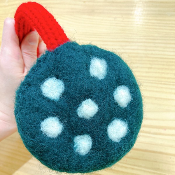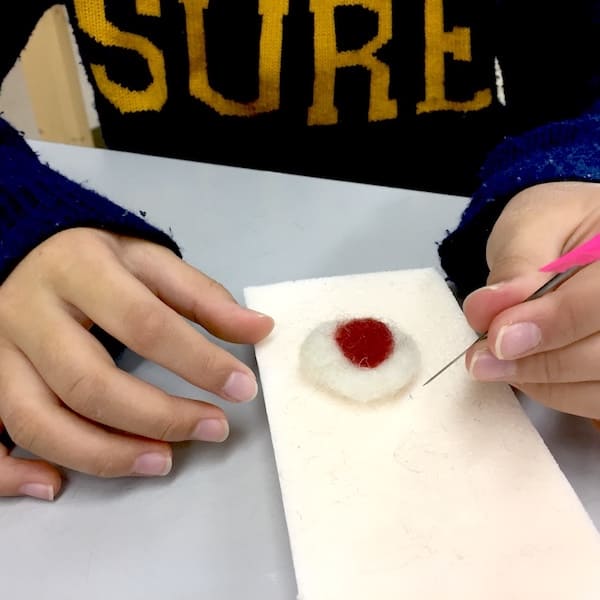 前回の制作から楽しみすぎて、早く制作したい!という子が授業前からそわそわと...羊毛を絡めてフェルトにした次は、毛糸を編んで頭の部分をつなげる軸のカバーをつくります。