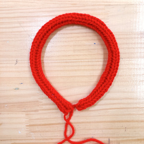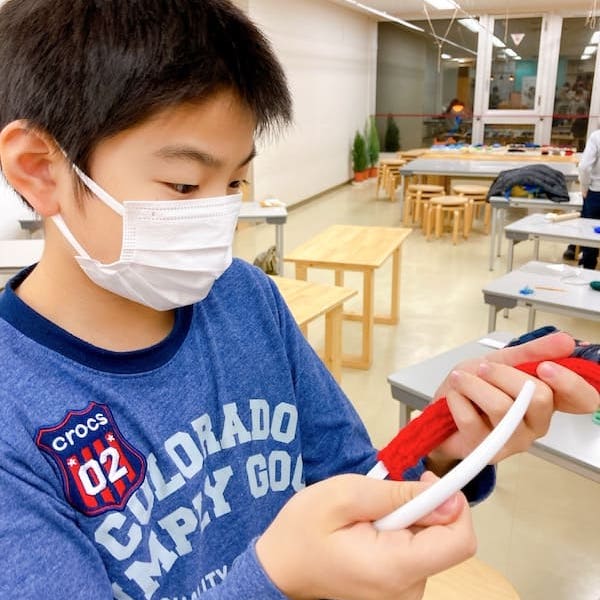 ある程度の長さができたら、軸に使うカチューシャを通してヘッド部分を仕上げていきます。うれしすぎて小躍りする子もいれば、編むのが大変すぎるので「カラフルな毛糸をぐるぐる巻きつける」という決断をする子も。それぞれの方法で、次回仕上げをしていきましょう。