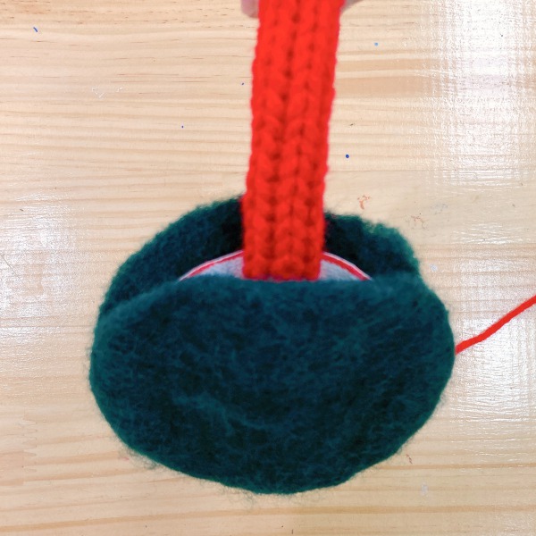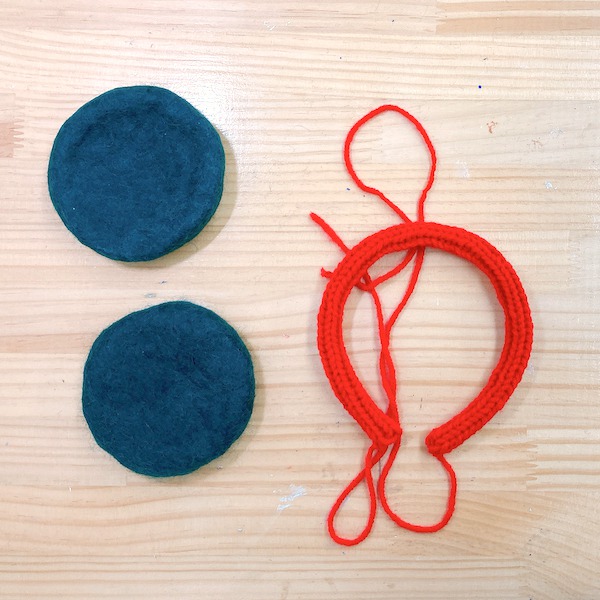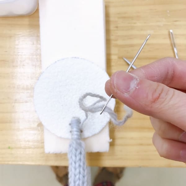 ふたつの丸い耳あて部分に穴を開け、中に芯を入れて穴を閉じる作業。ここは毛糸針で縫うのではなく、羊毛用のニードルで穴を塞ぎます。針先に小さな切り込みが入っている特殊なものです。