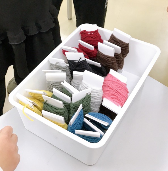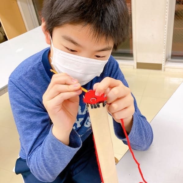 編み物が得意な子も不得意な子もいますから、はじめの糸かけのぐるり1周がどのくらい混乱するかなと思っていましたが、みんな集中力があり割とすんなりクリア。そして2周目以降からは教室内が急にザワザワと...「やったことある!」と思い出す子もいれば「ヘルプミー!」の手をあげる子も。