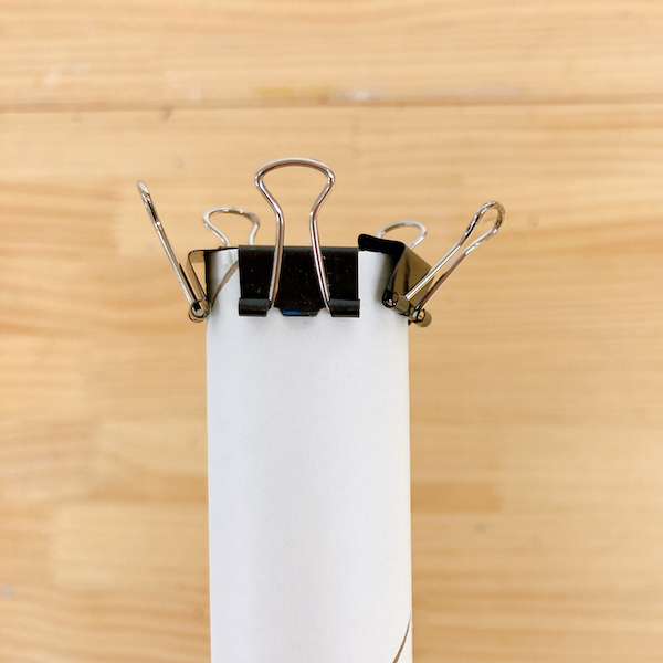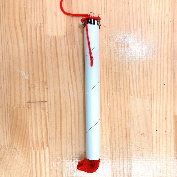 リリアン編みをするために、まずは編み機の制作から。といっても紙筒とクリップを利用したかんたんなセットなので、おうちでも作れそうなものです。好きな方はぜひ作ってみてください。
