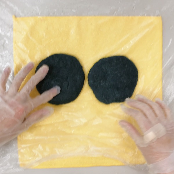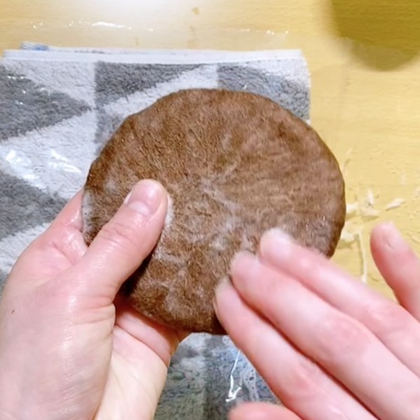 石鹸を溶かしたぬるま湯を少しかけて、そっと手で押しながらふわふわの羊毛を落ち着かせていきます。丸い型を置いたらひっくり返して裏も同じように...途中で「どこまで進んだっけ?」など混乱しないよう、集中して!