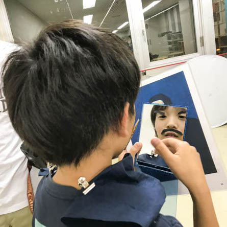 パッと決まる子もいれば「どうしよう…」と決めかねてしばらく迷う子もちらほらと。絵で模写をするのではなく自分が変身するなんて初めての試みですから、いつもと違う目線で見てしまいますよね。「聖徳太子のファンなので...」「キリストじゃん!」「青いターバンを巻きます」など制作前から早くも大盛り上がりです。