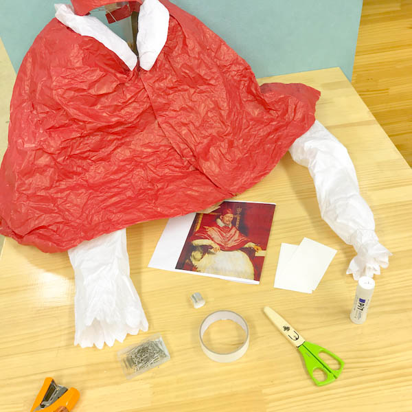 そのほかにもモデルの顔についているヒゲの形、手に持っているカゴ、演奏している楽器など、どうやって作るか迷いそうなアイテムもたくさんありましたが、アイディアを出し合い先生とも相談しながら制作を進めていきました。
